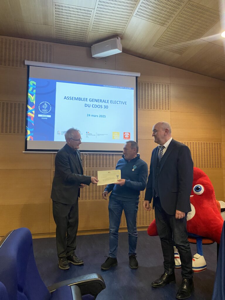 L’Assemblée Générale s’est clôturée par la remise de la Médaille d’Argent JSEA par Messieurs Yves CABON et Philipp MONTAGUT à William BRISSON, Président du Canoë-Kayak et Trésorier Général du CDOS 30 !