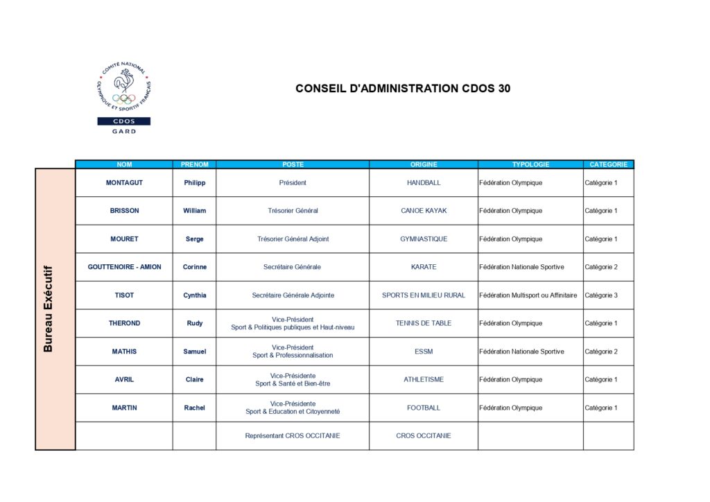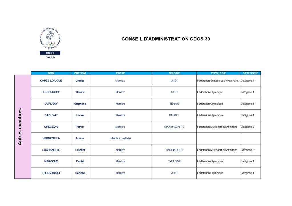 Le CDOS 30 souhaite la bienvenue aux nouveaux membres : Claire COLOT AVRIL pour l’Athlétisme, Rachel MARTIN pour le Football, Loetita CAPES-LOAIQUE pour l’UNSS, Patrice GREGEOIS pour le Sport Adapté, Rudy THEROND pour le Tennis de Table et Corinne TOURNASSAT pour la Voile !