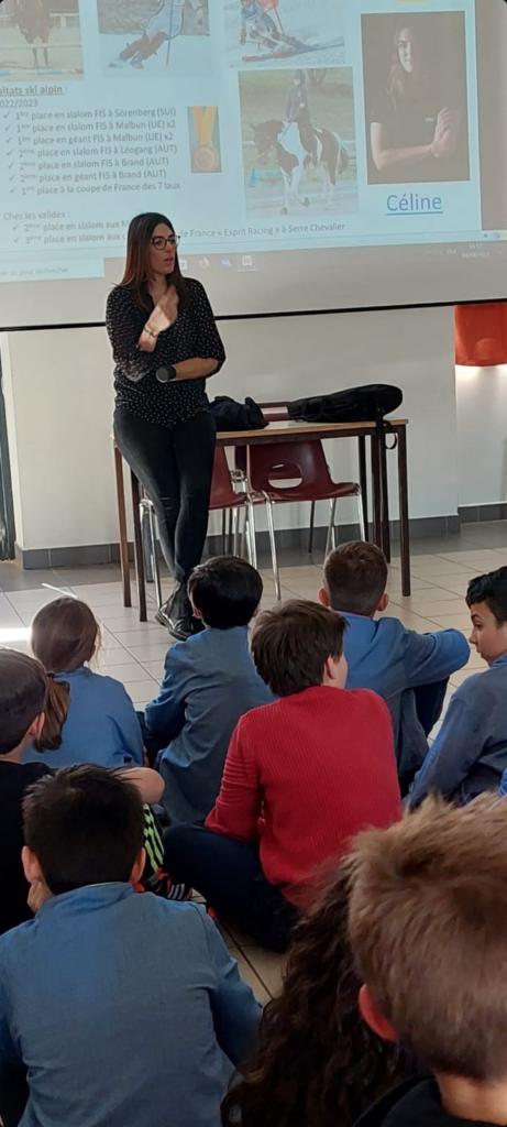 L’après-midi, nous avons accueilli Céline DEROUALLIERE, skieuse professionnelle qui vise les prochains Jeux Paralympiques d’hiver. Les élèves de CM1, puis de CM2 ont pu passer du temps avec elle. Ils ont été épatés par toutes les activités sportives qu’elle exerce, par sa force de caractère, son humour et sa joie de vivre.
