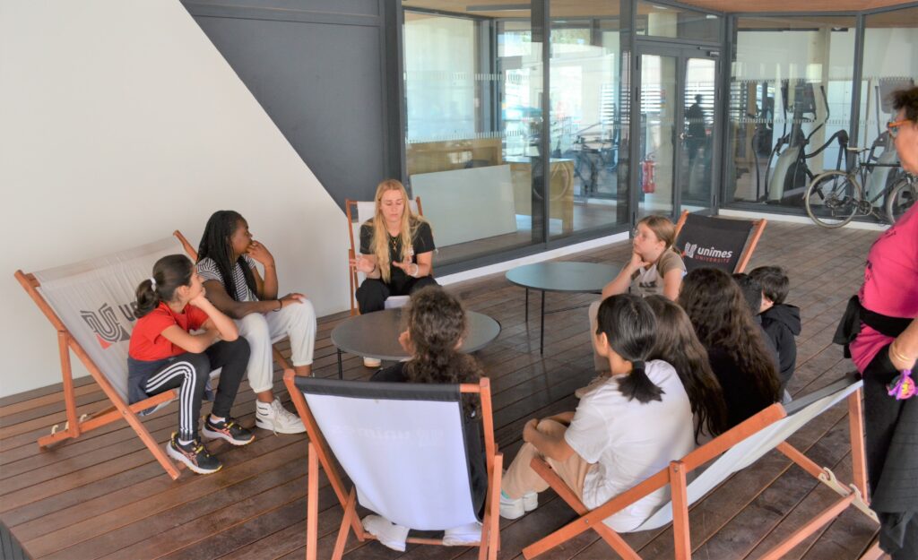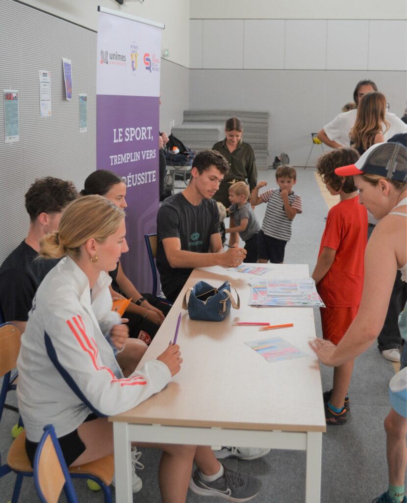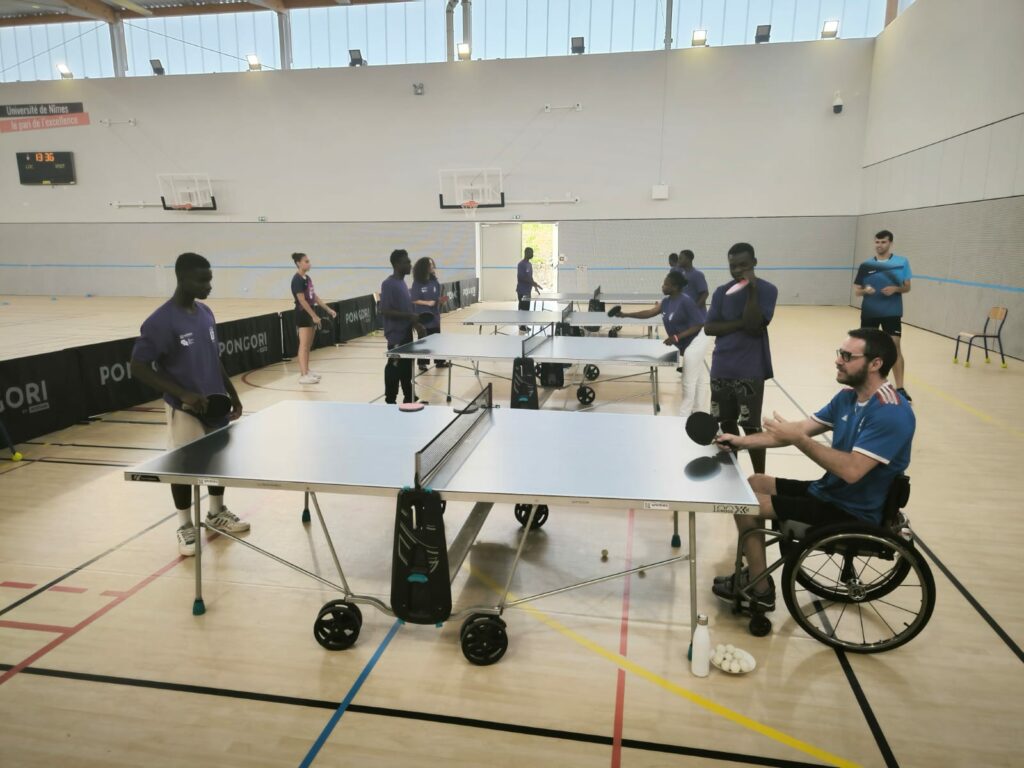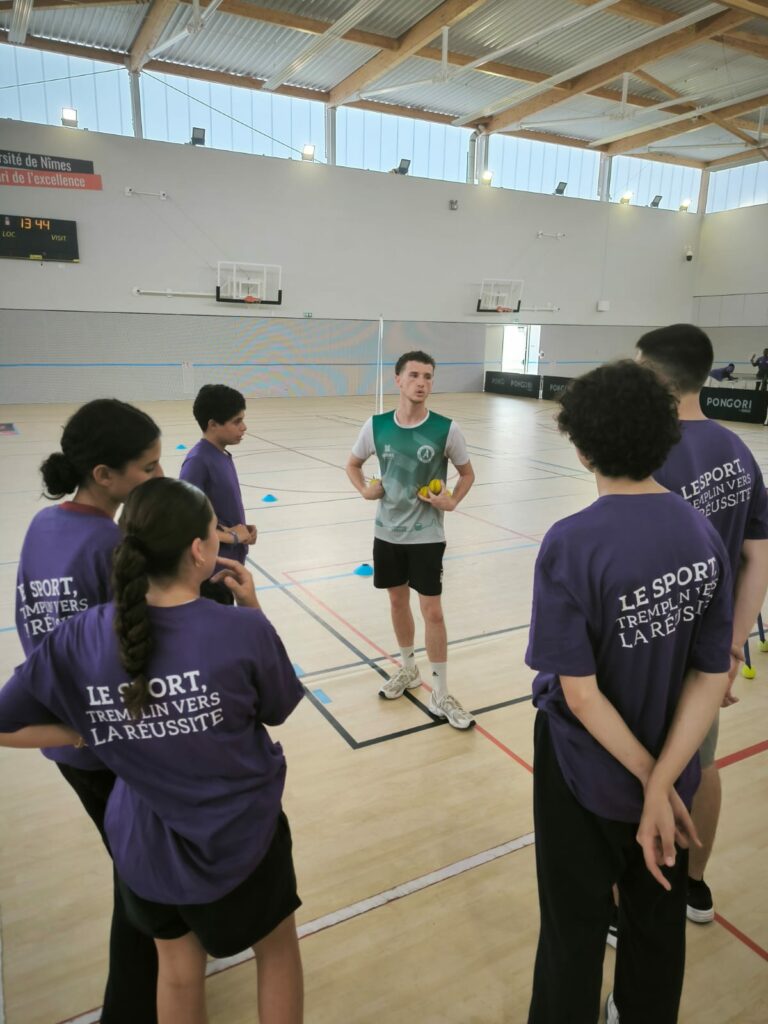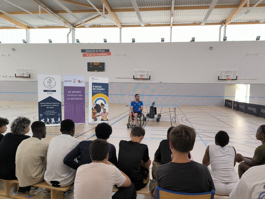 L’après-midi, le CDOS s’est associé à la filière STAPS de l’Université de Nîmes, dans le cadre de la traditionnelle Journée Olympique organisée dans le cadre du dispositif les Cordées de la Réussite. Après une conférence sur la mixité dans le sport, les collégiens ont eu la chance d’échanger et de pratiquer aux côtés d’Alexandre DELARQUE, sportif en para tennis de table. Ils ont également participé à plusieurs ateliers ludiques : baseball 5, mur interactif et un jeu de l’oie géant sur le sport féminin.
