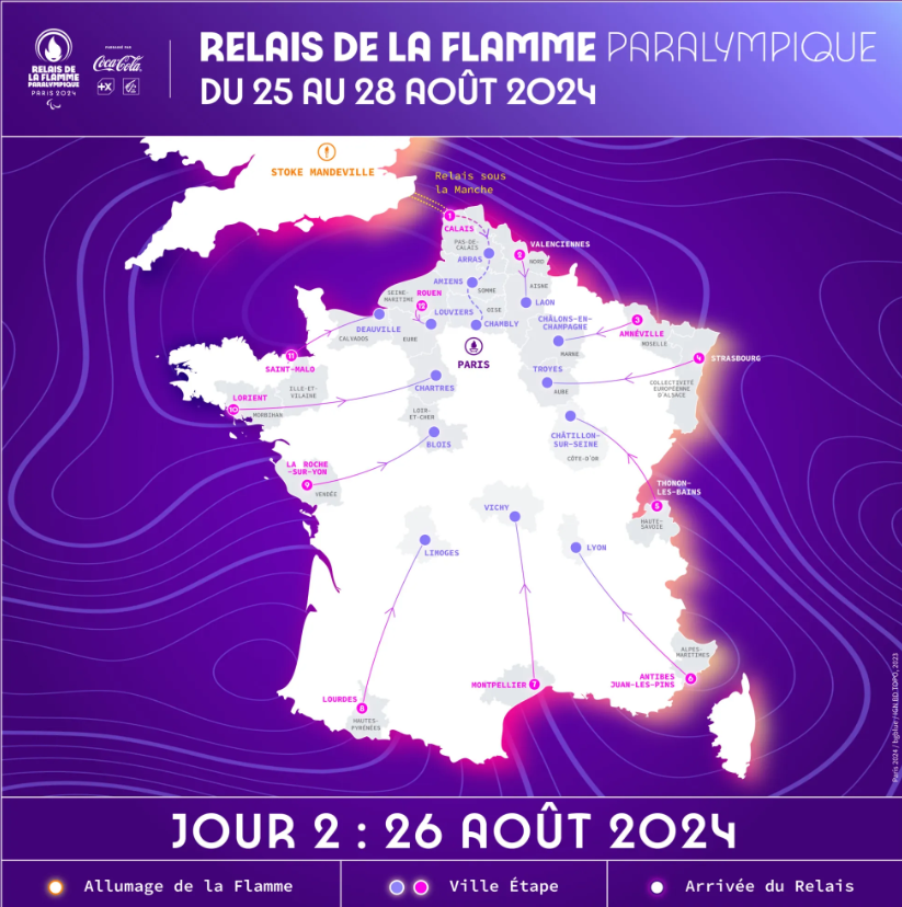 Paris 2024 a révélé le parcours du Relais de la Flamme Paralympique, qui se tiendra du 25 au 28 août 2024. La flamme sera allumée à Stoke Mandeville, passée entre athlètes britanniques et français sous la Manche, puis divisée en douze flammes à Calais. Elle sera portée par 1 000 éclaireurs dans 50 villes en route vers Paris, marquant le début des Jeux Paralympiques de Paris 2024, avec un accent sur l'inclusion et le partage de l'énergie des Jeux. Ce Relais marquera l’arrivée du match retour de Paris 2024 : les premiers Jeux Paralympiques d’été de l’histoire organisés en France.